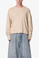 The Ribbed Long Sleeve Shirt is constructed from 100% cotton jersey with a pigment dyed finish. Designed with an oversized fit, it features a wide neck opening with ribbed detailing, drop shoulders, and self-finished cuffs and hem.
