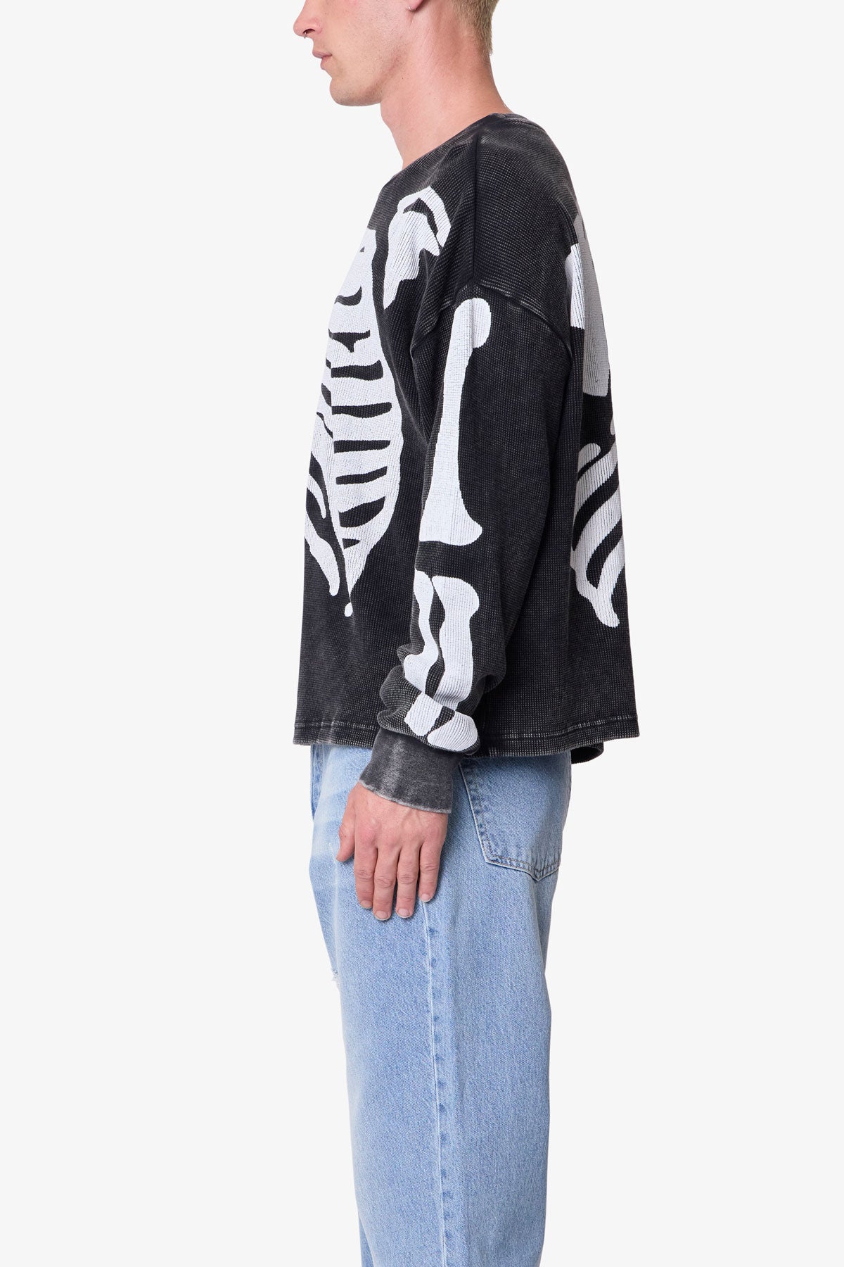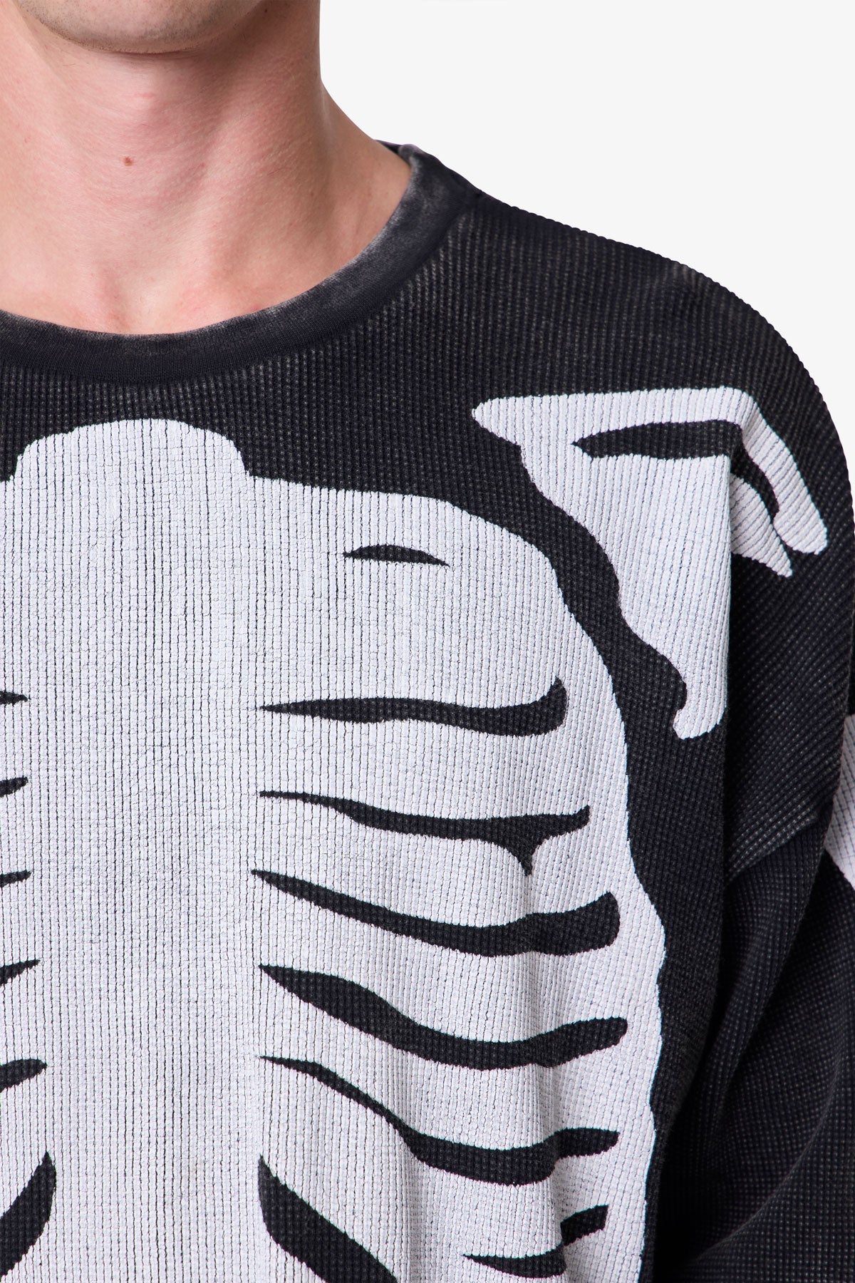 Constructed from 100% cotton waffle thermal with an acid wash finish, the Skeleton Thermal L/S Shirt features a standard fit and full-length sleeves. Designed with a front and back screen printed skeleton rib cage, plus screen printed arm bones along both sleeves. The print is pre-washed with the garment for a lightly distressed effect and subtle cracking. Finished with ribbing at the neck, sleeve cuffs, and bottom hem.