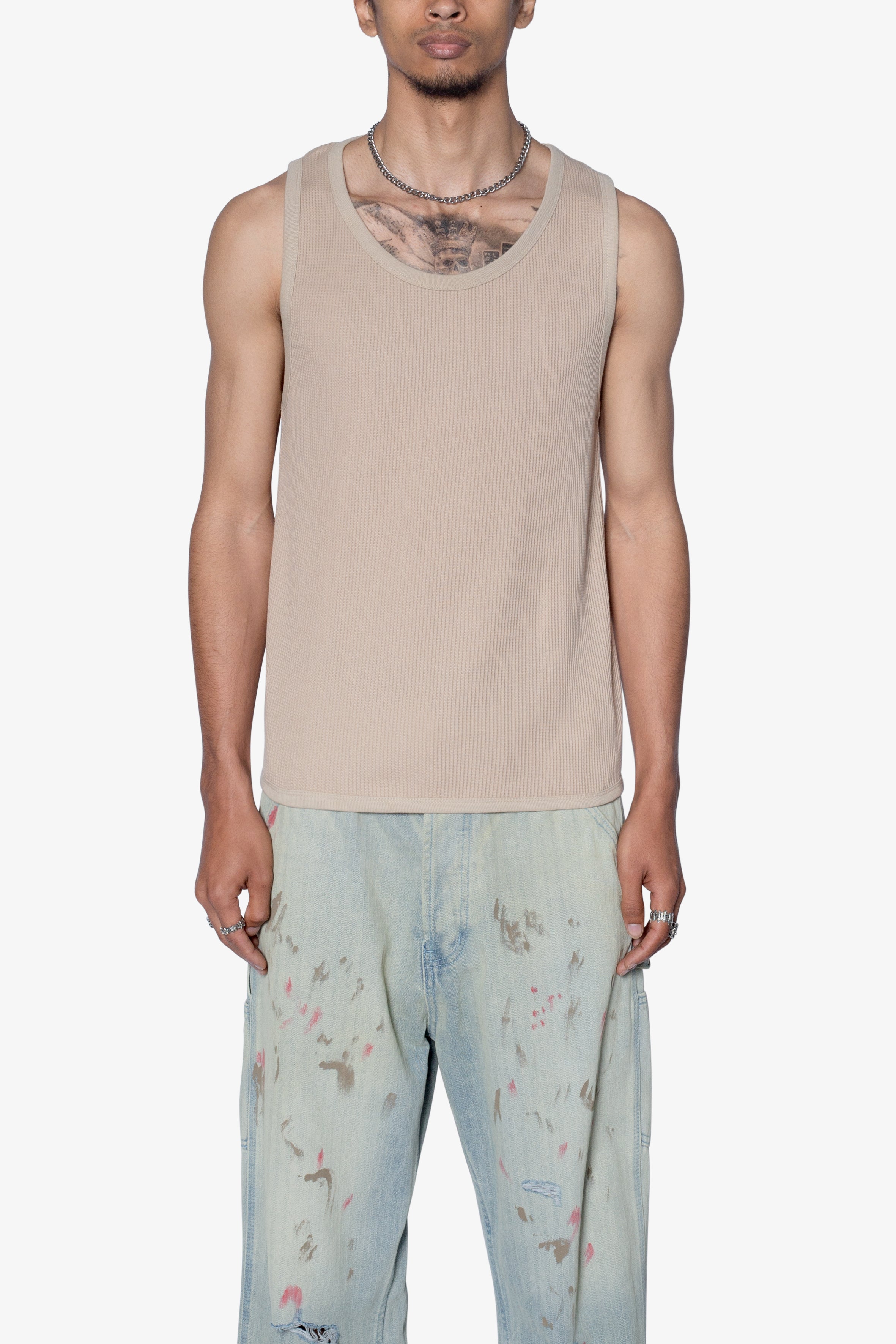 the Waffle Knit Tank is a 100% cotton tank is perfect as a base layer or worn alone. the tank features taping at the neck and arm openings, a flat hem, and is constructed in a ribbed material.