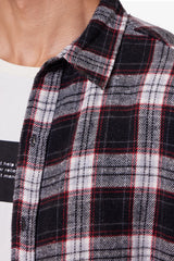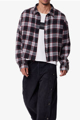 The Washed Cropped Flannel Shirt features a cropped silhouette constructed from 100% cotton brushed flannel with a heavy acid wash treatment for a worn, vintage look. Designed with a raw hem, front button closure, and buttoned cuffs, the shirt is finished with a soft texture and structured fit.