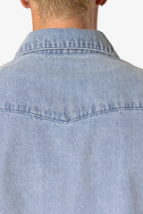 the Washed Denim Button Up Shirt is made from a 100% cotton fabric, light blue base wash, mis-contrast pocket shadowing, bleach spotting, unreleased hem, and white mother of pearl button snaps.