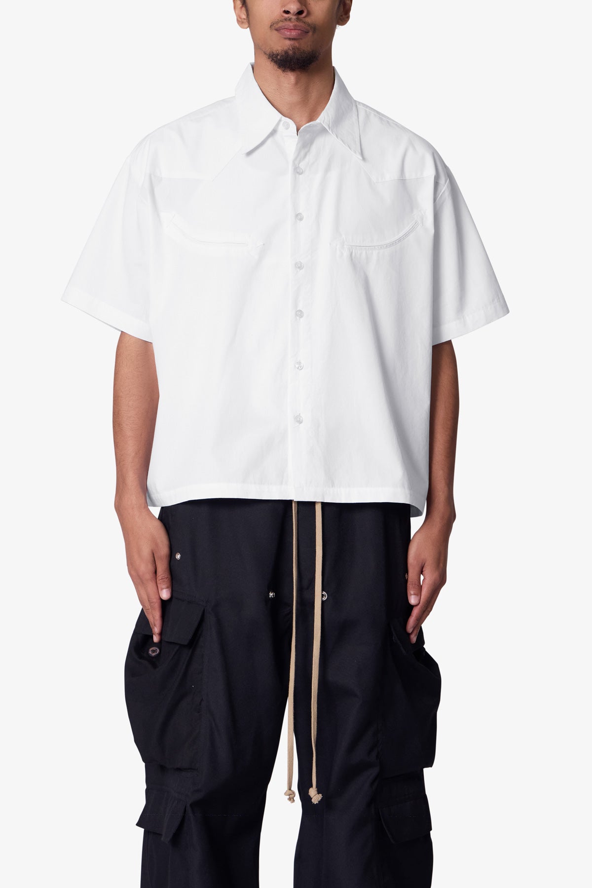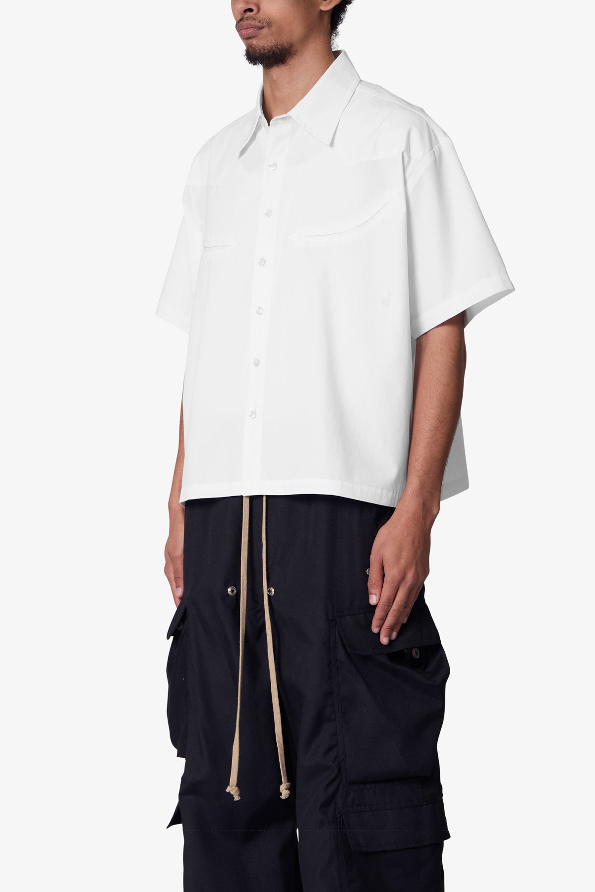The Western Button Up Shirt is designed with a relaxed, cropped silhouette that delivers a clean, structured presence. Made from 100% cotton, the fabric feels lightweight yet substantial, offering a smooth hand with everyday durability. The shirt is finished with a classic button placket, a flat cropped hem, and signature smile pockets at the chest for a subtle nod to western detailing.
